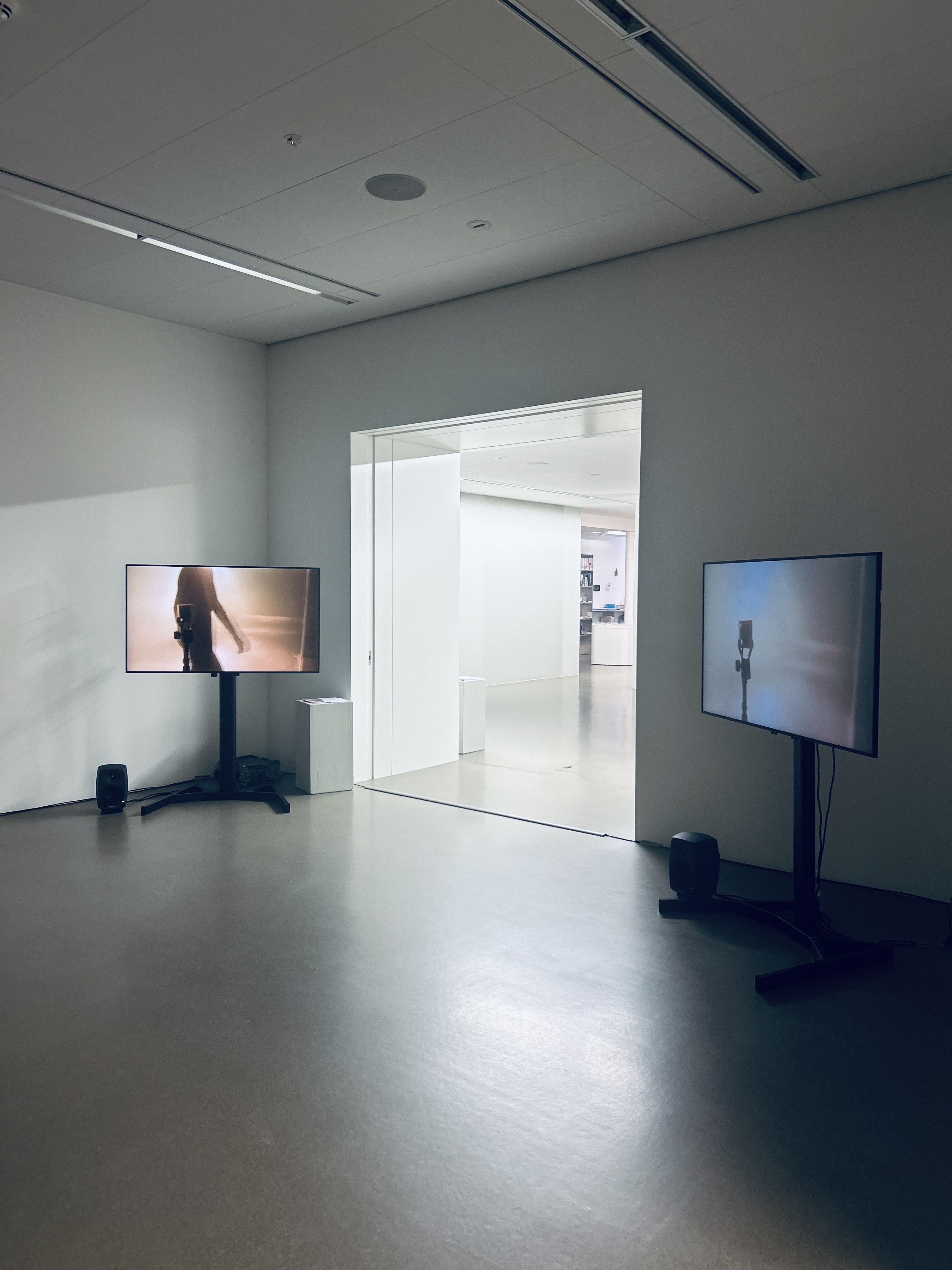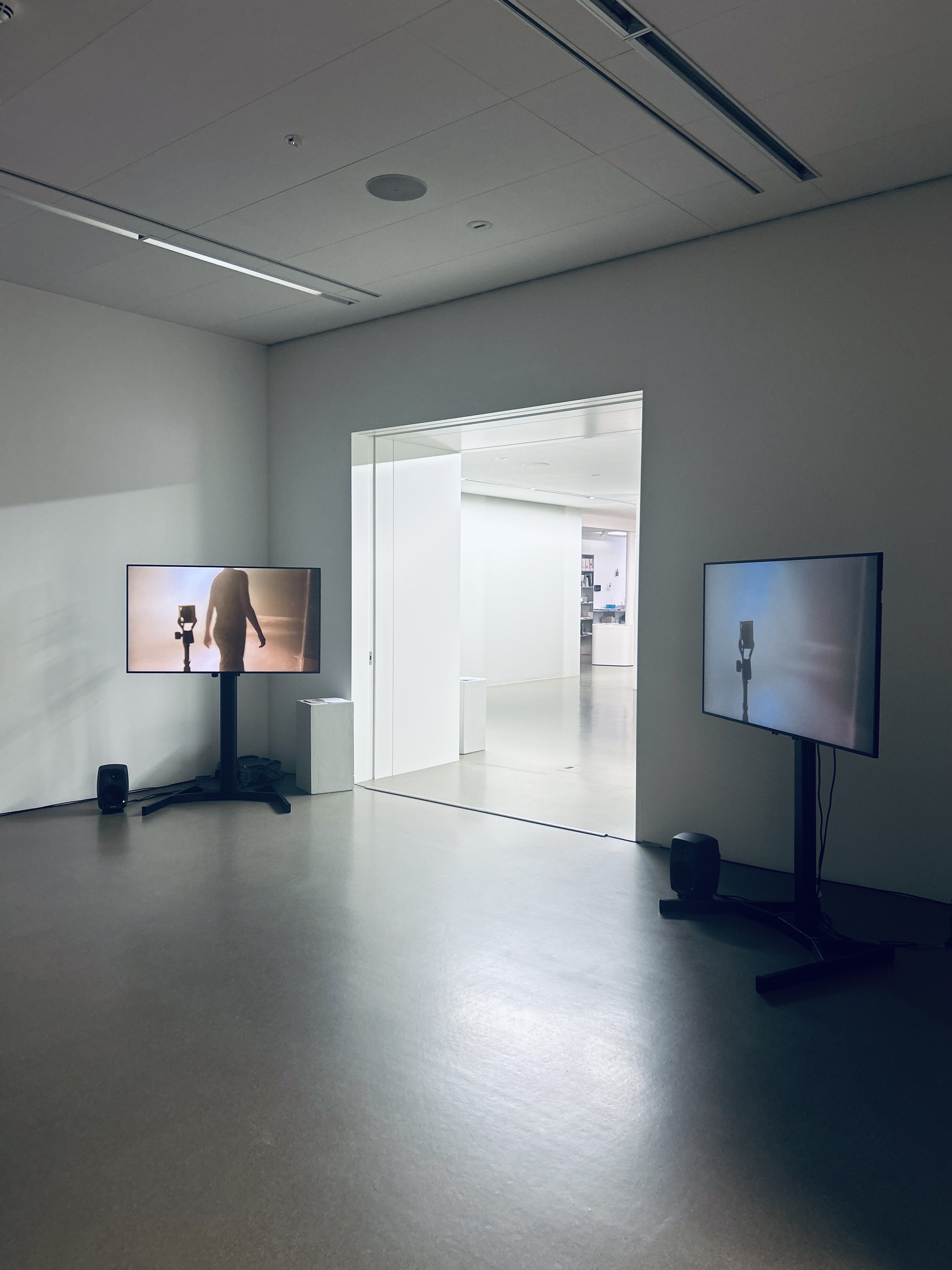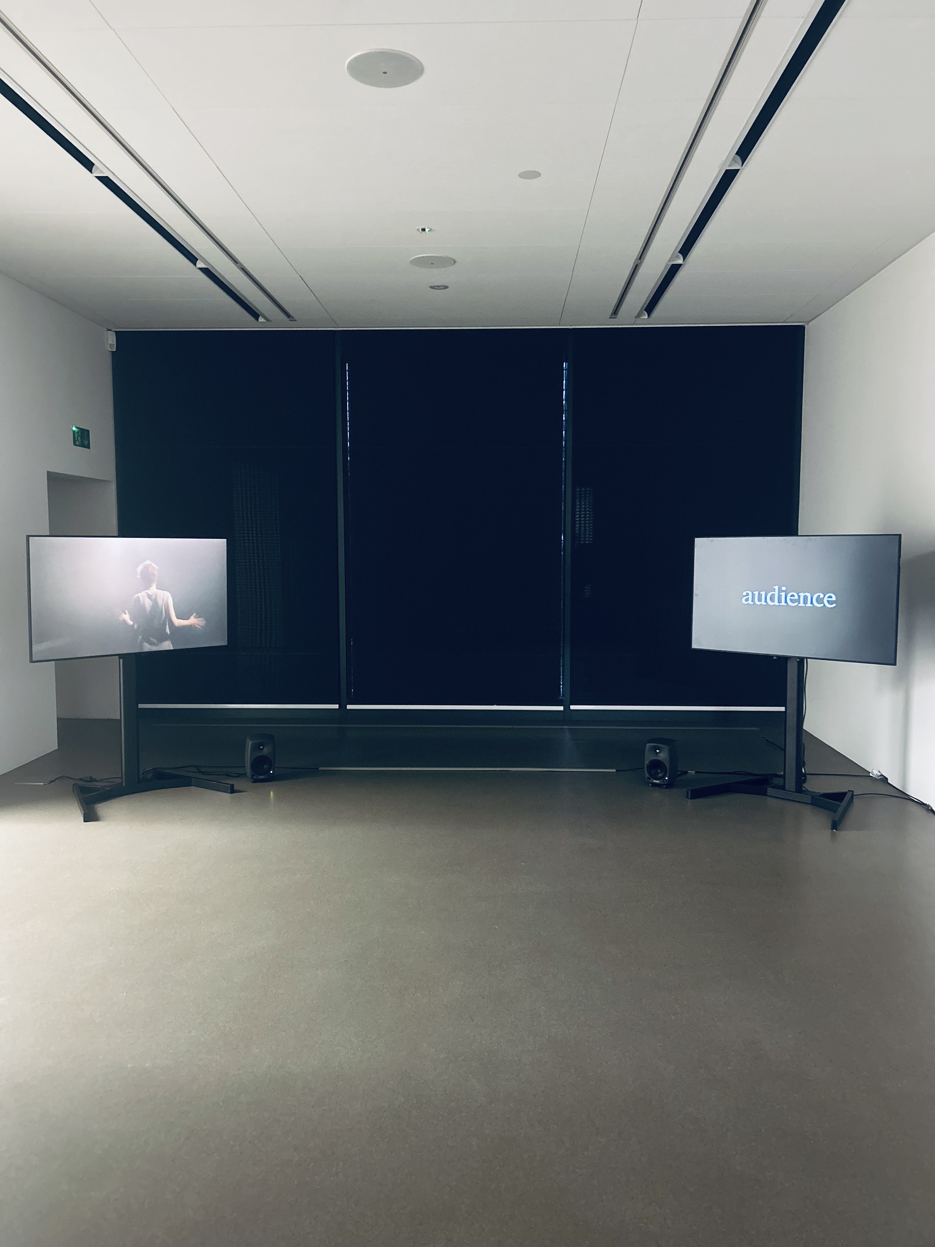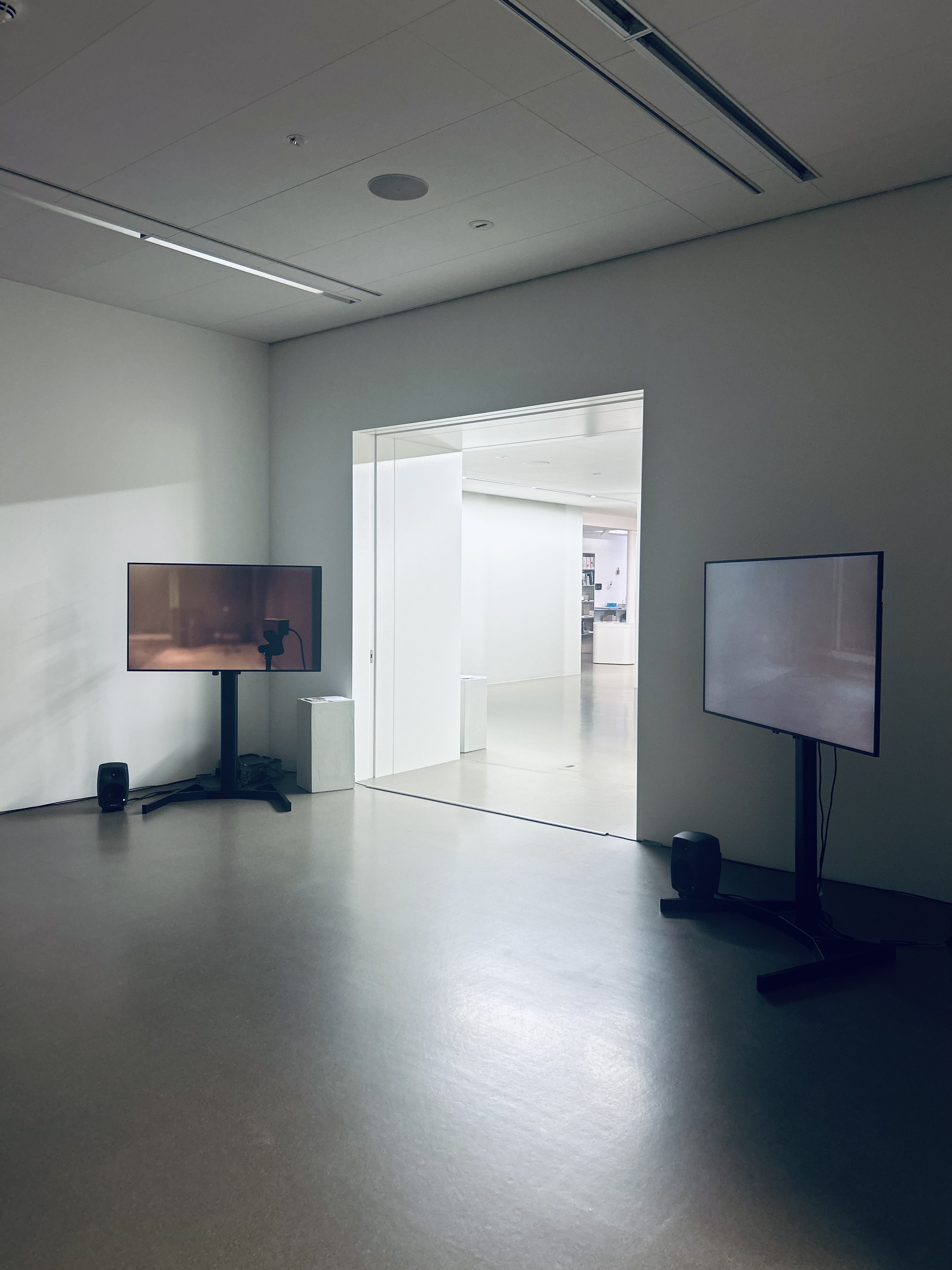 In einem Raum stehen sich vier Bildschirme mit vier Lautsprechern diagonal gegenüber. Auf den Bildschirmen ist eine Frauenfigur zu sehen. Sie läuft durch alle Bildschirme im Uhrzeigersinn, im Kreis. Die Frauenfigur bewegt sich durch die Bildschirme und bewegt so den Sound durch den Raum. Es erklingen Field Recordings, Interviews, Audiodeskriptionen, Musik.