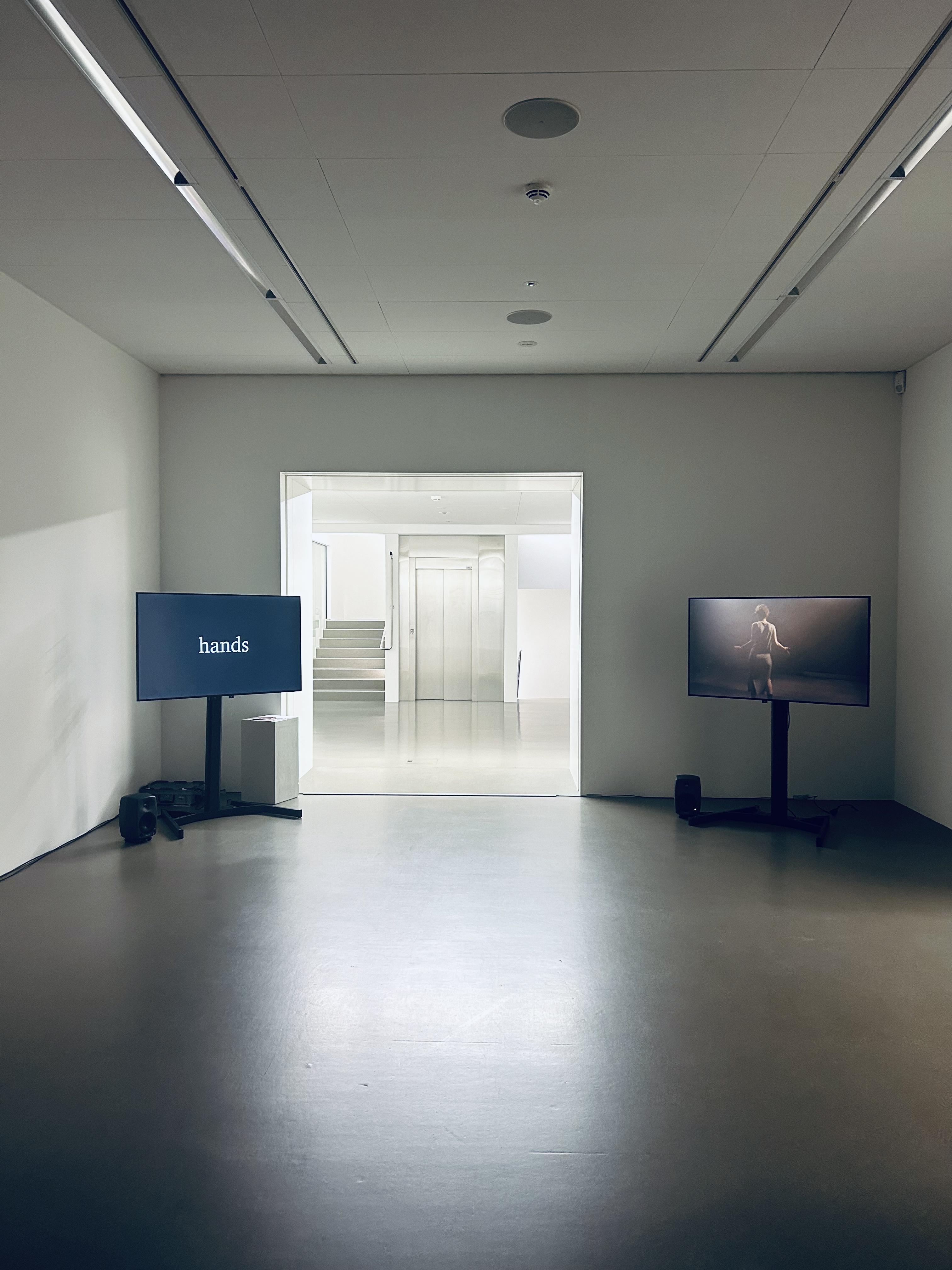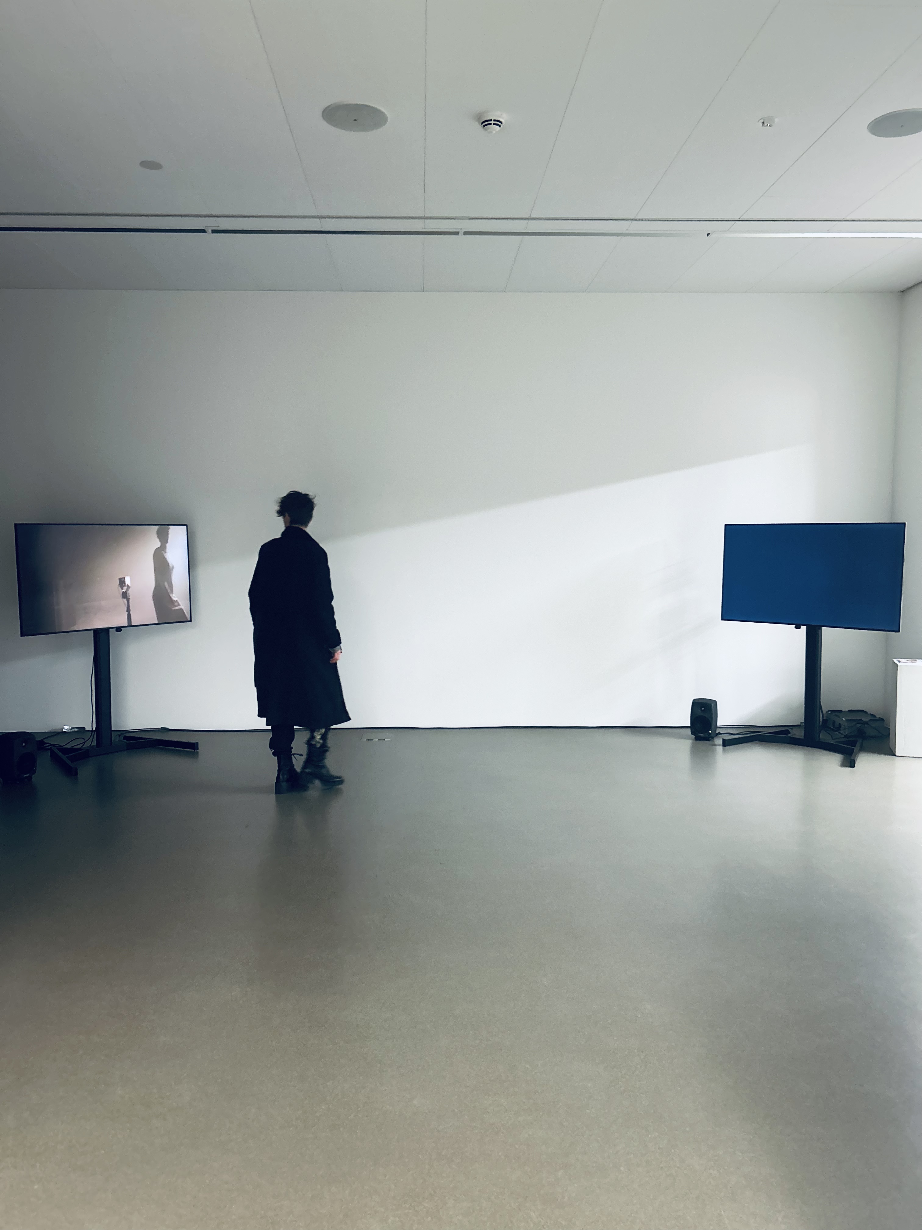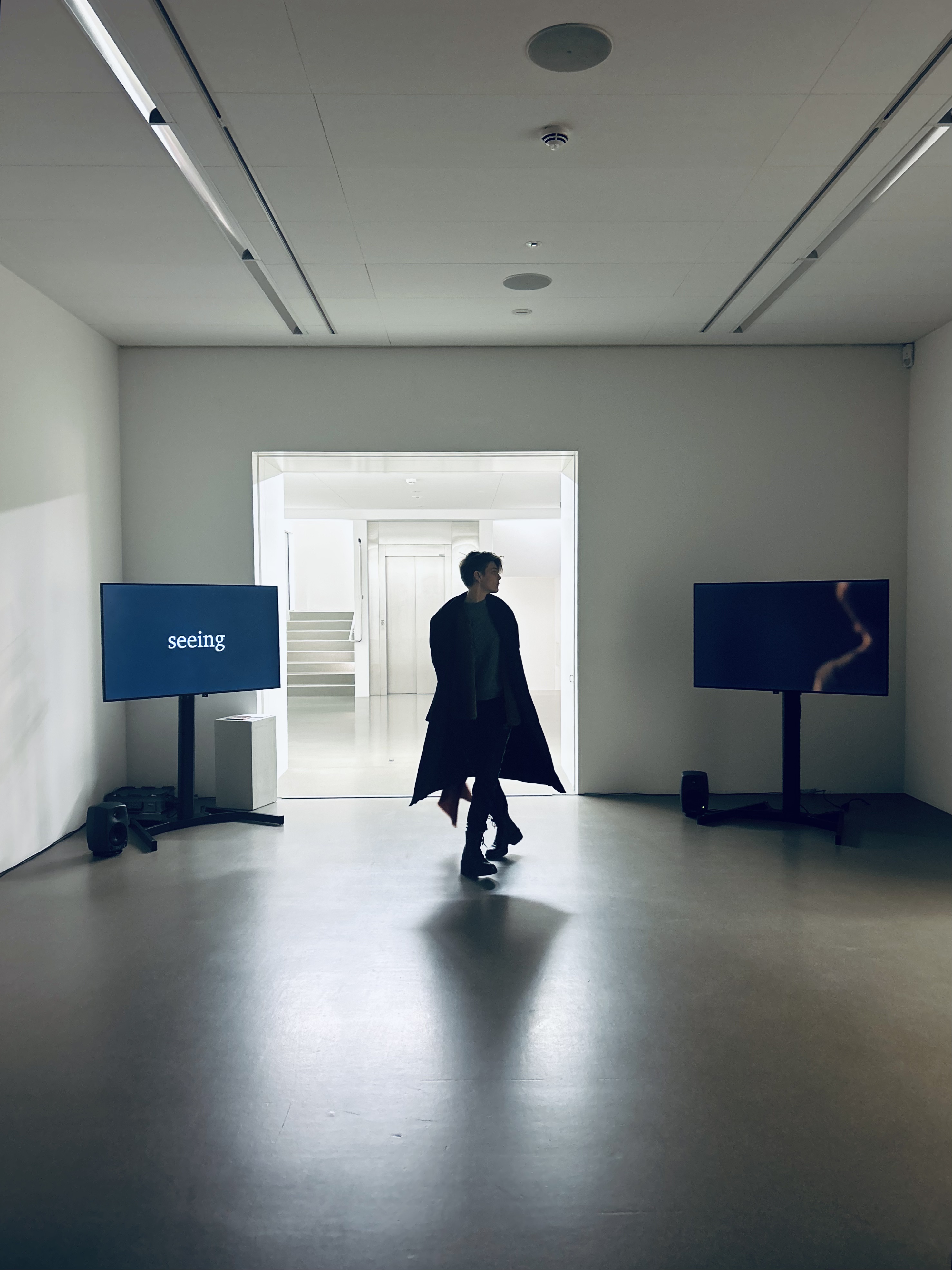 In einem Raum stehen sich vier Bildschirme mit vier Lautsprechern diagonal gegenüber. Auf den Bildschirmen ist eine Frauenfigur zu sehen. Sie läuft durch alle Bildschirme im Uhrzeigersinn, im Kreis. Die Frauenfigur bewegt sich durch die Bildschirme und bewegt so den Sound durch den Raum. Es erklingen Field Recordings, Interviews, Audiodeskriptionen, Musik.
